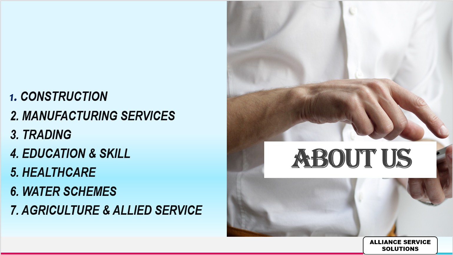 Alliance Service Solutions is a multi-disciplinary organization engaged in construction, consultancy, healthcare infrastructure, water supply schemes, education & skill development, and allied services.